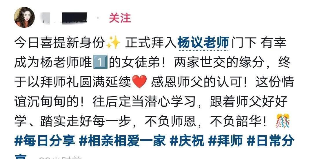 这也就罢了,业内人之间的较量,本来就是你不让我、我不让你。可63岁的杨议又开山门,收了一名年轻貌美的女徒弟,而拜师礼的场面更是举止亲密不堪入目。这位女徒弟网名为“津门依姐”,是一名网红博主。在社媒平台高调宣称自己是杨议“唯一女徒弟”,还说两家是世交。但津门依姐的穿搭、以及和杨议的亲密动作,引起网络热议。